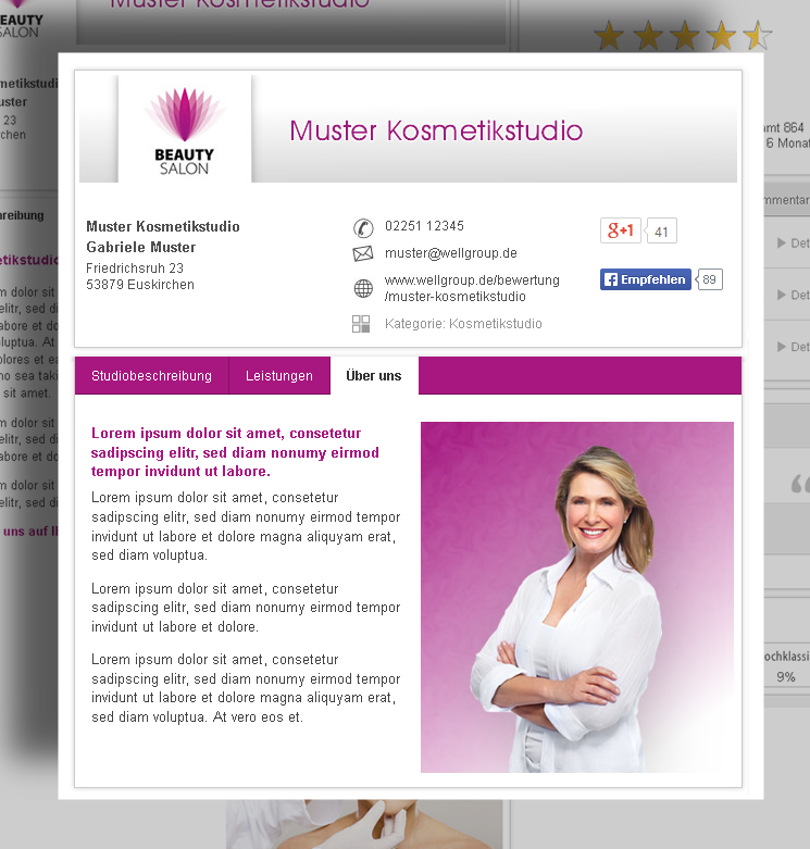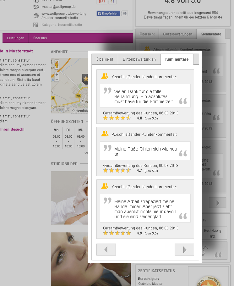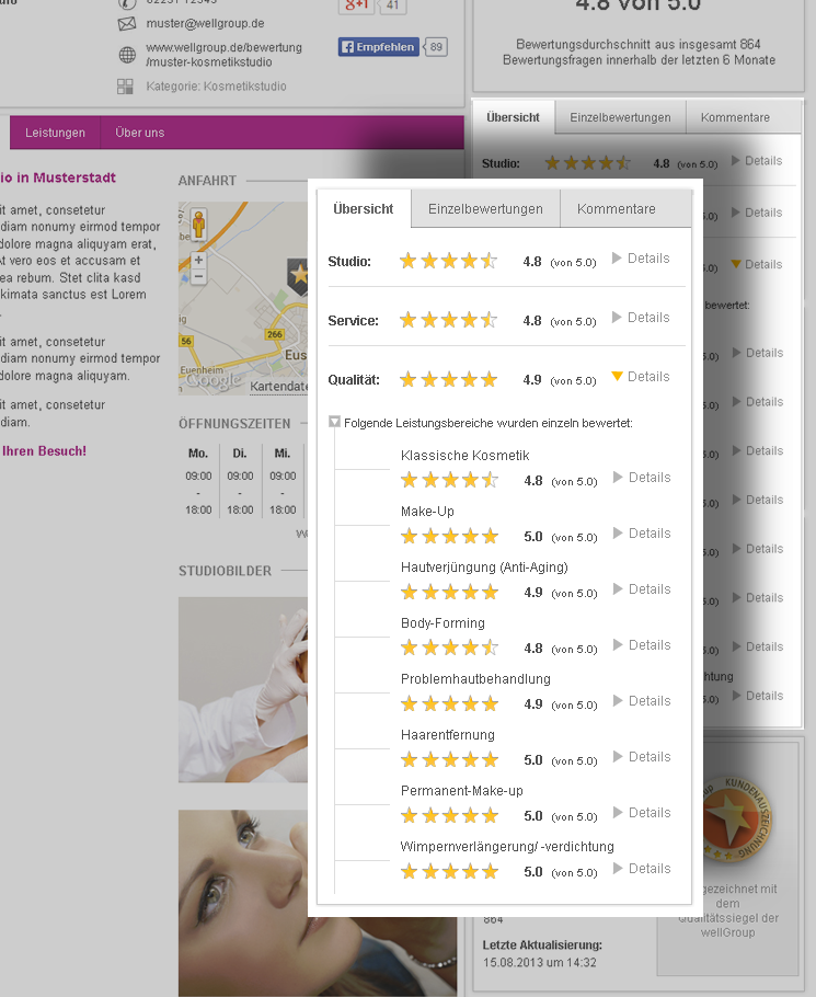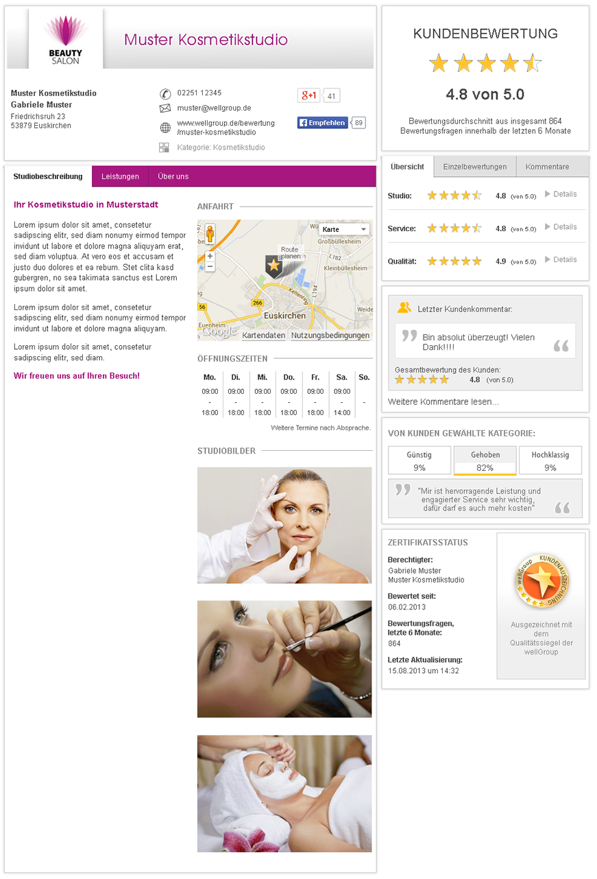 Dies schafft Transparenz und damit Vertrauen, da wellGroup Studiobewertungen für Neukunden glaubwürdig und verlässlich sind.
