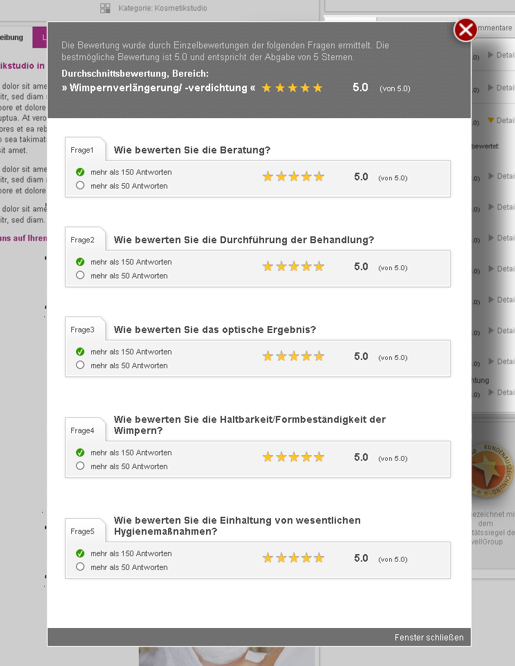 Die mit dem Qualitätssiegel Ihrer Homepage verbundene Zertifikatsseite bietet dem Besucher ein detailliertes Meinungsbild Ihrer Kunden.